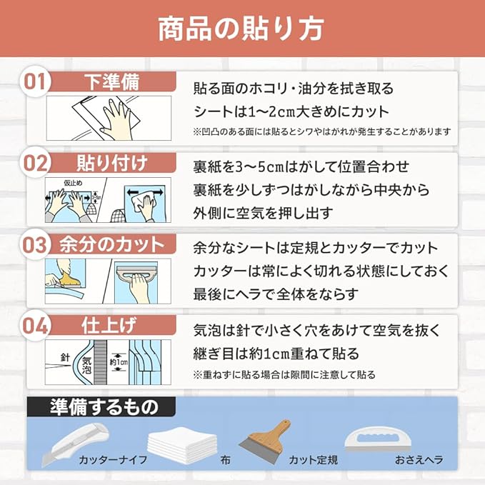●位置合わせは充分に確認して、一度で貼るようにしてください。弱い下地の場合は、貼り直しができませんので注意してください。