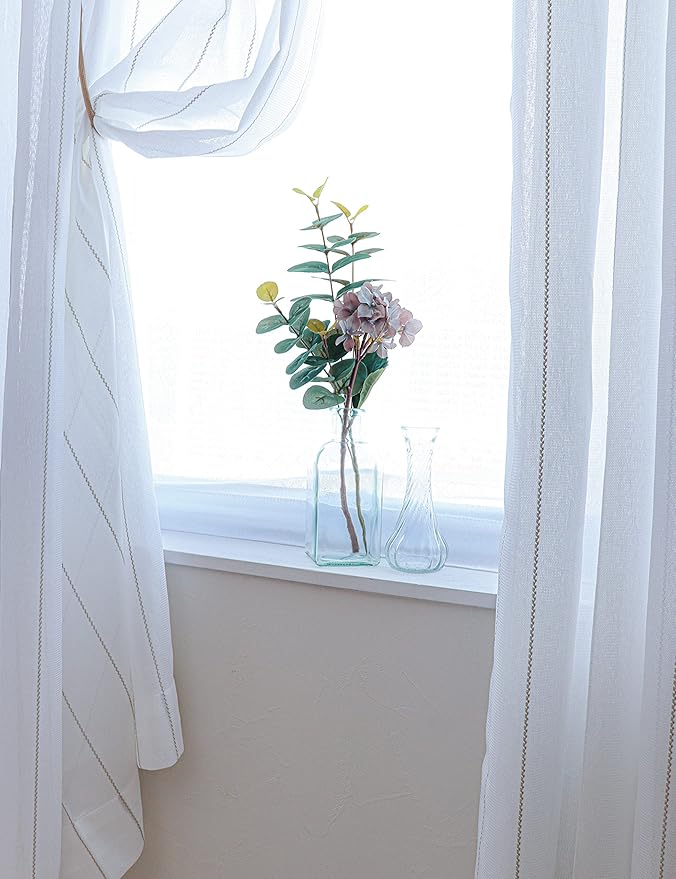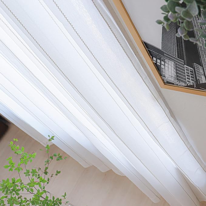 夜も外から見えにくい 遮像 レースカーテン UVカット レース 2枚組 + カーテンフック取り付け済み ストライプ柄 クリームベージュ 幅100 丈133cm 2枚セット