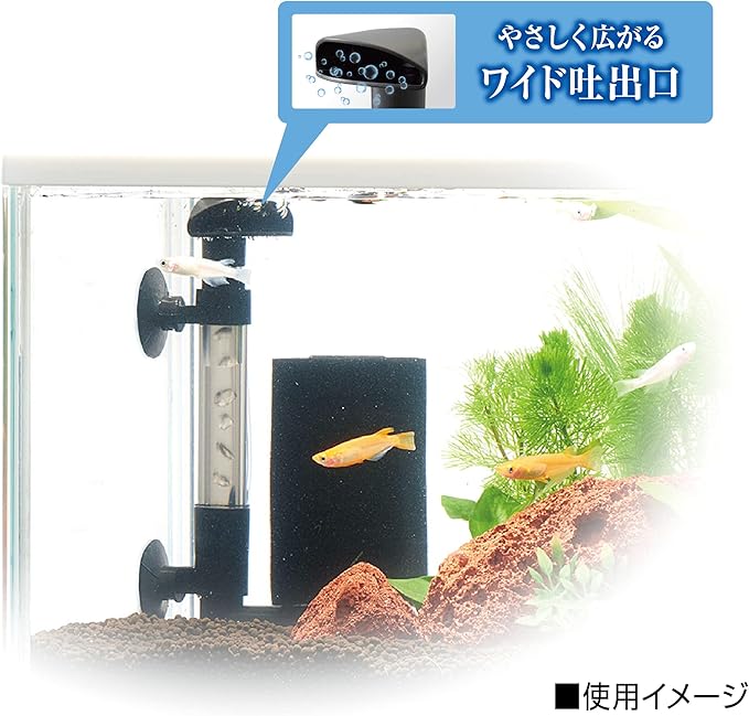 エアーをやさしく拡散させるワイド吐出口とエアー調節バルブで、メダカにやさしい水流をつくります。卵・稚魚を吸い込みにくい高密度スポンジ採用。