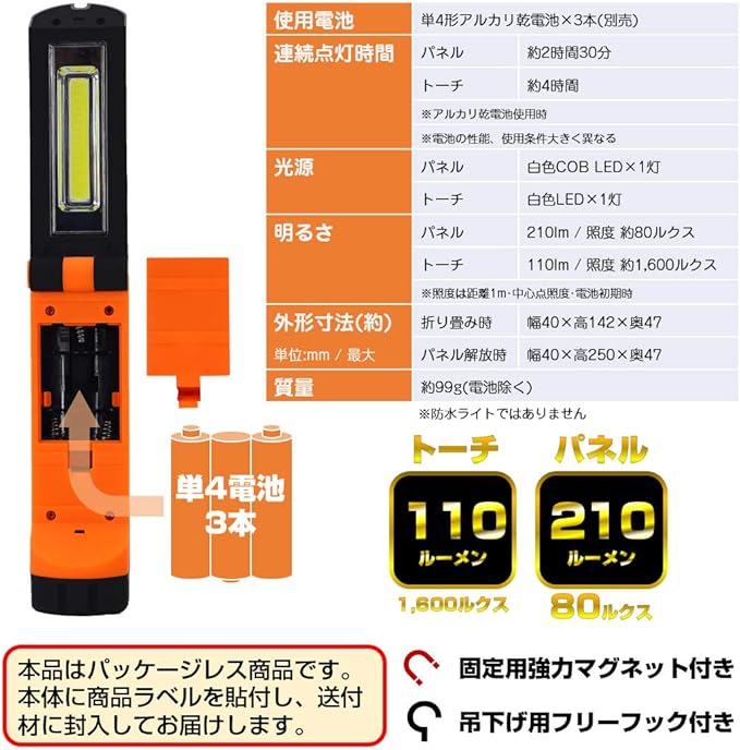 ・電池寿命:COB LEDパネル 2時間30分、LEDトーチ 4時間