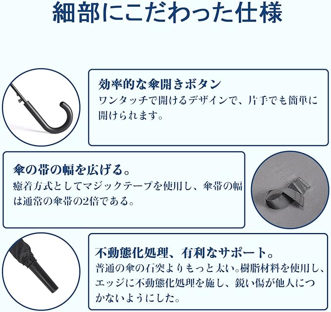 【詳細仕様】全長の長さ:87cm / 親骨の長さ:65cm 直径:95cm(最長部分:118cm) 生地伸びる部分:26cm 持ち手の長さ:15cm 持ち手の太さ:2cm 石突の長さ:7cm 親骨:グラスファイバー 生地素材:ポリエチレン100% 手元素材:ABS