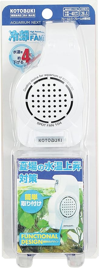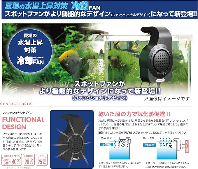◆商品説明:外掛式。40cm[26L]以下の小型水槽用の冷却ファン。360度全方向から空気を取り入れる事が可能なファンクショナルデザイン採用。乾いた風の力で気化熱促進。