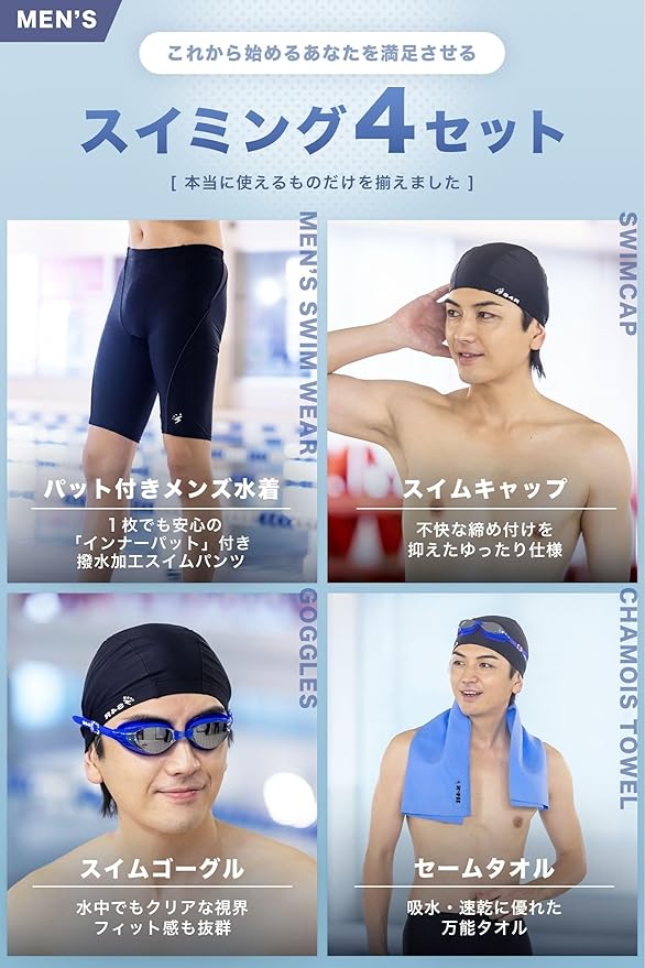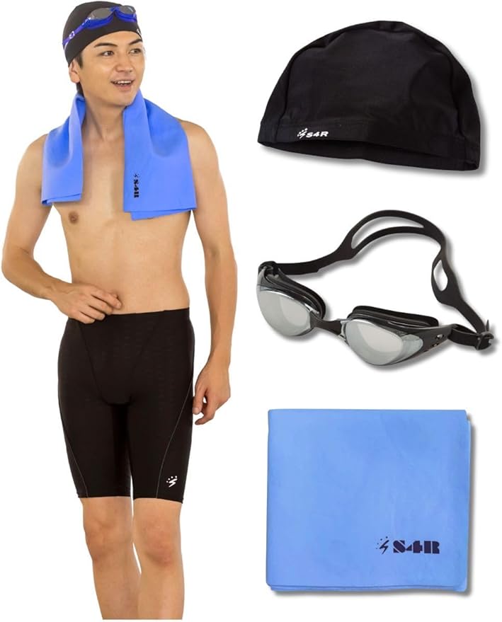 [エスフォーアール] 【2025年 メンズ 水着 4点セット 競泳水着 スイムキャップ スイムゴーグル セームタオル【スイミング入門スターターキット】 水泳帽 ゴーグル 曇り止め 吸水速乾タオル お得 スイミング用品 (S M L XL XXL) | ryouhinshop