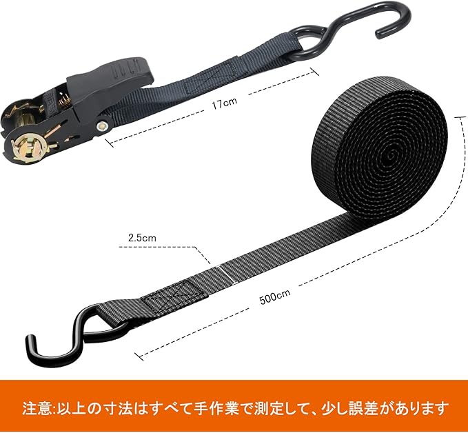 【商品仕様】長さ:5m、幅:25mm、重さ:1.8KG、セット:4本。破断強度:800kg;最大使用荷重:225kg