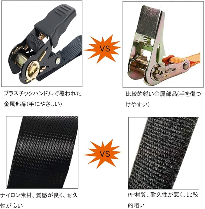 【ラチェットベルト】高品質のナイロン素材を採用して、強度と耐久性は抜群で、ラチェット機能付きで、しっかりと荷物の締め付けが行えます。