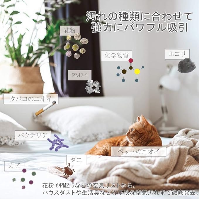 【製品機能】集じんフィルター:花粉やアレル物質(ダ二のフン・死骸)、ウイルス、カビ菌、 ホコリ、タバコの煙(粒子)、ペットの毛など。(0.3μmの粒子によるフィルター単体の捕集性能) 脱臭フィルター:タバコのにおい、 トイレのにおい、生ゴミのにおい、ペットのにおいを除去します。(タバコの有害物質(一酸化炭素など)は除去できません)