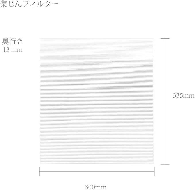 【製品仕様】集じんフィルター:335X300X13 mm;脱臭フィルター:322 X300X 3 mm。材質:ポリプロピレン・ポリエステル・活性炭。
