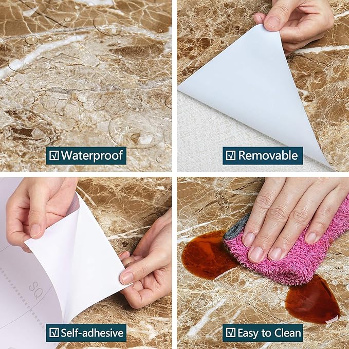 VEELIKE 大理石シート リメイクシート 壁紙シール 大理石調 ブラウン 光沢 40cmx3m カッティング のり付き 剥がせる 貼って剥がせる壁紙 防水 耐熱 防汚 防油 防カビ 厚手 おしゃれ DIY インテリアリ 賃貸 OK 模様替え リフォーム用 キッチン 台所 玄関 浴室 トイレ テーブル 家具 補修 壁面 キャビネット