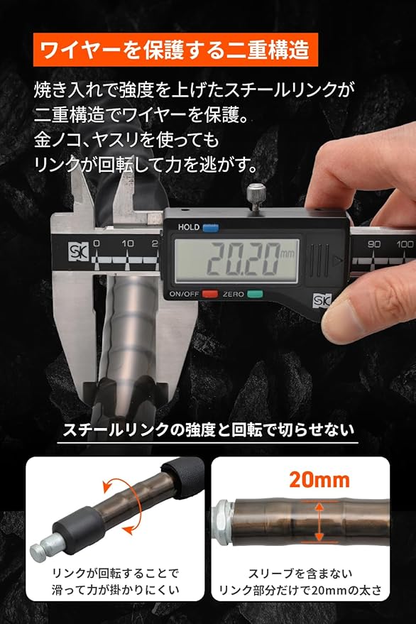 スチールケーブルを焼き入れ済みスチールリンクでカバーした二重構造。