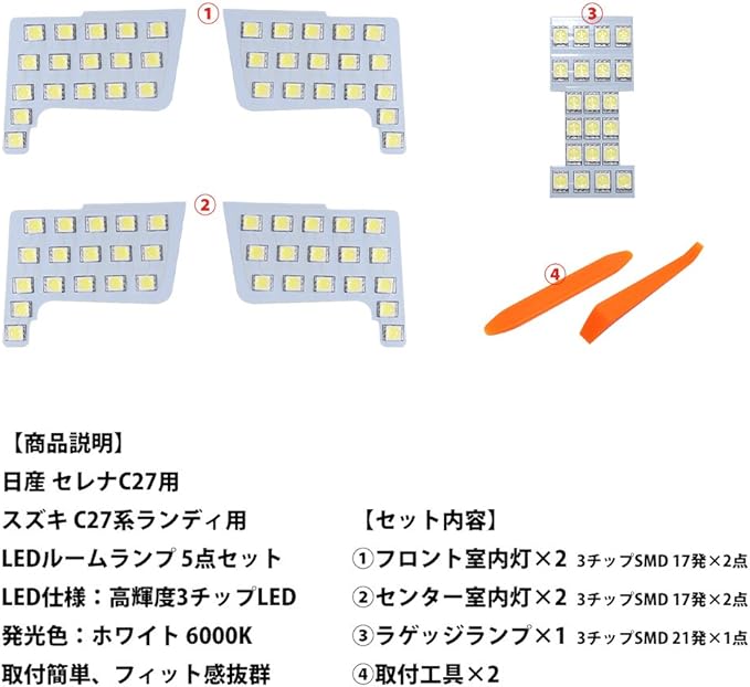 製品情報:LED ルームランプ 【適合車種】:日産 セレナC27 H28.9~ 全グレード、スズキ ランディ SGC27 SGN27 H28.12~ 全グレード【発光カラー】:ホワイト 6000K。【セット内容】:フロントランプ 2、センターランプ 2、ラゲッジランプ 1、全5点。