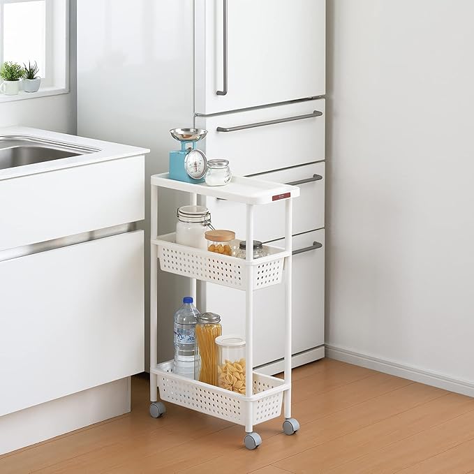 カラー:ホワイト | サイズ:スリム3段 移動も簡単なキャスター付きワゴンです。最下段には2Lのペットボトルが縦置きできます。