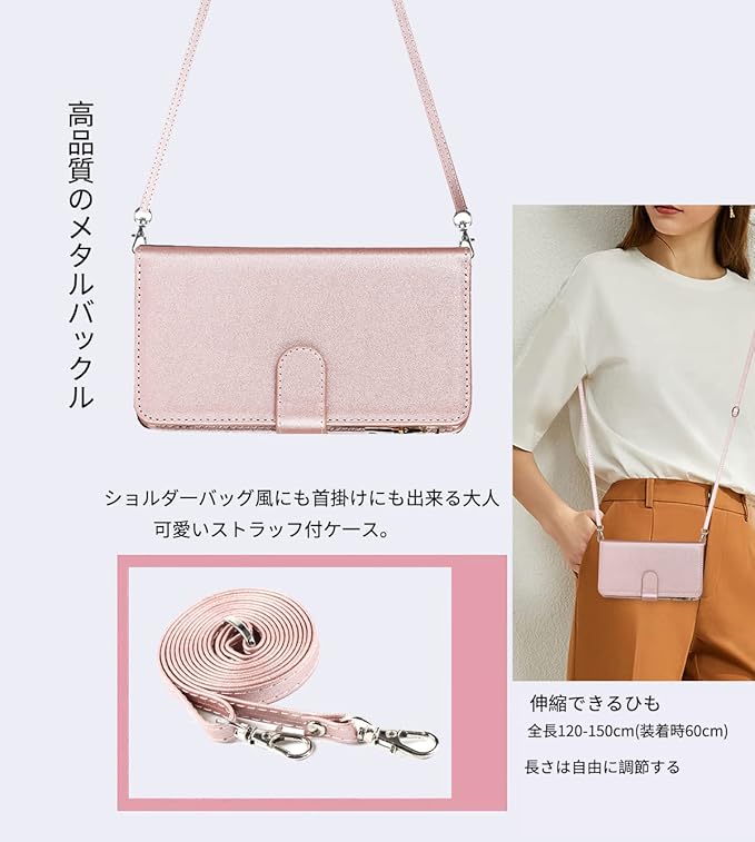【クロスボディチェーン&リストストラップ】調節可能ショルダーストラップ長さ1.1メートル、可斜めがけ、可肩掛け。携帯電話が紛失する恐れはなし、ハンドバッグを持たずにどこでも旅行の贅沢さを満喫できます。ケースだけが必要な場合、ストラップは取り外し可能です。
