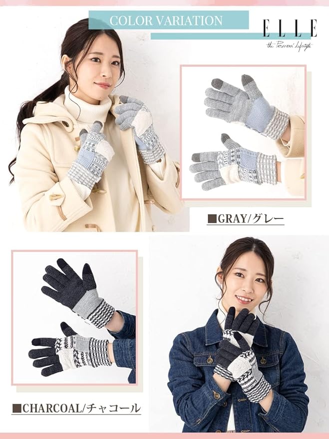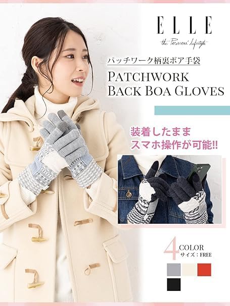 [ELLE] エル 可愛い パッチワーク柄 レディース ニット 手袋 ケーブル 編み グローブ ふわふわ 裏ボア スマホ対応 ギフトケース付