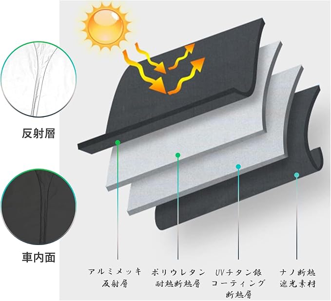 【材質・構造】シェード アクア 初代 高密度アルミメッキ反射層・ポリウレタン耐熱断熱層・UVチタン銀コーティング断熱層・ナノ断熱遮光素材。4層構造を採用し、4つの異なる材質が共同でサンシェードの反射層と断熱層を構築し、夏の日差しの猛烈な照射を遮断させ、車内の温度を減らすことができます。また、99%以上の紫外線の侵入を効果的にカットし、健康を守ることができます。高品質・高密度のナイロン布を使用して作られ、軽量で耐久性に優れています。