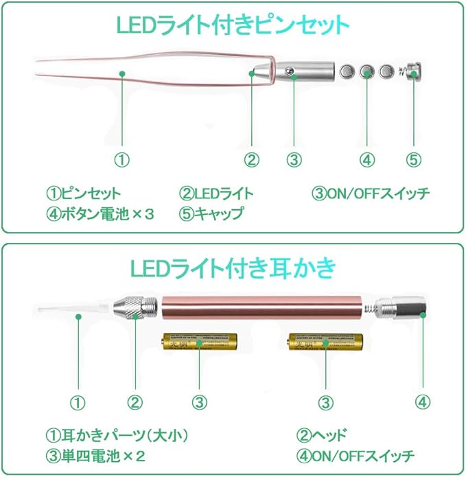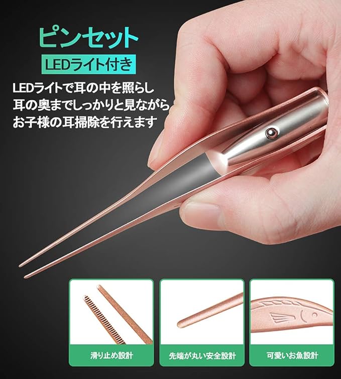1.LEDライト付きの耳かき&ピンセットの耳掃除セット。お子様用やお年寄り用に最適、家庭用としても大変便利です。