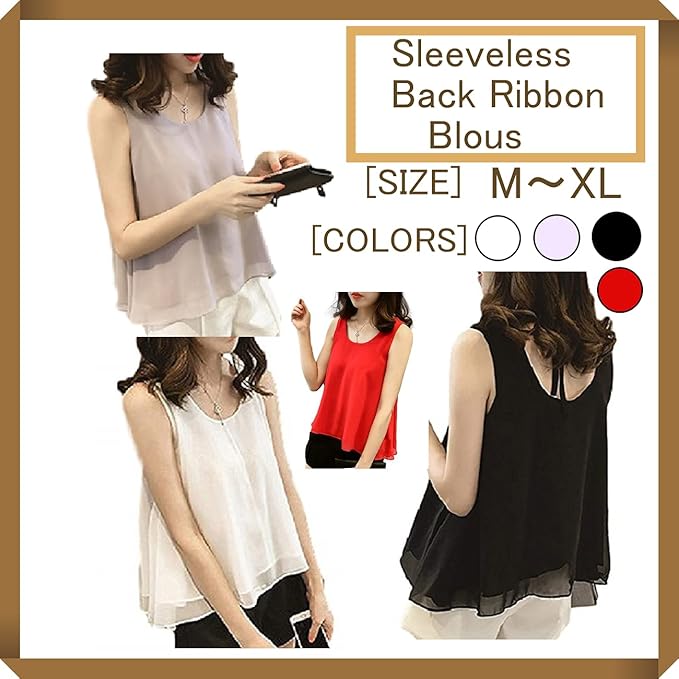 【上品でフェミニンなデザイン】背中のリボンが特徴的な、ふんわりと広がるAラインシルエットのノースリーブブラウスです。後ろ姿まで可愛らしく演出しつつ、ゆったりとしたフォルムが体型を自然にカバーしてくれます。首元の開き具合も絶妙で、デコルテを美しく見せる女性らしいデザインです。