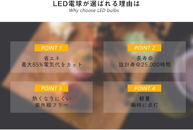 【省エネ&エコ】消費電力が少ない、紫外放射がほとんどない、水銀などを含有していない、環境に優しいLED電球です。
