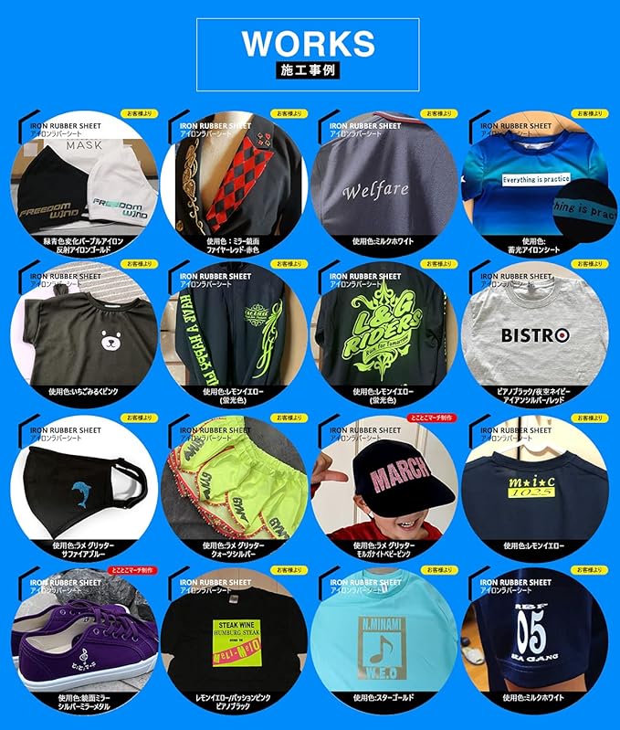 【サイズがぴったりサイズではございません。少し長めにカットします。】綿やポリエステル素材を推奨しますが、確実な接着を保証するものではありません。※生地の種類や状態によっては、接着できない場合があります。必ず事前にテストを行ってからご使用ください。※撥水加工など特殊加工が施された生地や、熱に弱い生地にはご使用できません。・色や種類によって、若干の厚みや質感の違いがあるため、同じカット設定では切れない場合があります。必ずテストカットを行ってからご使用ください。またプレス時間や剥がすタイミングも、色や種類によって異なる場合があります。事前にテストを行ってからご使用ください。 ■使用方法 1)シートをカットする道具が必要です。はさみ、アートナイフ、(お持ちの方はカッティングマシーン)、カットマットなど用途に合わせてご準備ください。熱転写するのでシリコンシートもご用意ください。(”シリコン樹脂”のクッキン グシートなどでOK!) 2) デザインをカットします。転写時には反転させる必要があるため、カットデータは反転して作成してください。光沢のある面が「剥離フィルム面」となります。裏面(マット側)をカットしてください。3)カッターやアートナイフで不要部分を剥がし、剥離フィルムに余分なものが残らないようにしっかりカス取りします。 4) 転写の準備をします。カス取りが完了したら、Tシャツなど転写したい生地と一緒に、デザインしたシートを透明の剥離フィルムが上になるようにアイロン台の上に置き、位置を調整します。 5)アイロンをかけます。熱いとアイロンシートも溶けやすくなるのでアイロンを弱設定(約110℃)で5~15秒ほど、押さえるようにしっかり当ててください。密着が不十分な場合は、再度アイロンをかけ、プレス時間を延長したり温度を少し上げて調整してください。(「弱・中・強」表示の場合は、取扱説明書またはメーカー情報をご確認ください。) 6)少し冷ましてから剥離フィルムを剥がしてください。※フィルムがくっついている場合は、無理に引っ張らず、様子を見ながら丁寧に剥がしてください。《ワンポイントアドバイス》剥離後に一部が浮いている場合は、再度シリコンシートを重ね、アイロンを軽くかけると密着します。 7)完成です!しっかり圧着できていれば完成です!シートに生地の繊維の凹凸が見えていれば成功のサインです。※本製品は生産工程上、静電気によりホコリが貼る面と剥がす面の間に付着する場合がありますが、使用上問題はございません。
