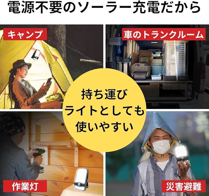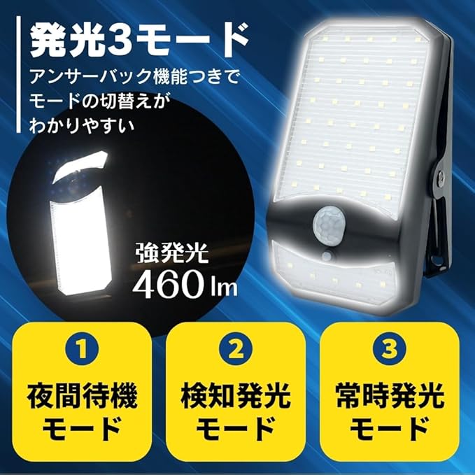【3つの点灯モード】(常夜灯+人感モード)周囲が暗くなると、常夜灯として弱発光。人を検知すると強発光。15秒後に常夜灯発行に戻ります。(人感モード)周囲が暗くなっても発光しません。人を検知すると強発光し15秒後に消灯。(常夜灯モード)周囲が暗くなると常夜灯として弱発光。センサーは作動せず、満充電で最長40時間連続発光。【どこにでも簡単設置】クリップみたいに挟むだけの簡単設置。太陽光で充電するソーラータイプで、電池不要。キャンプや釣りなどのアウトドアや、庭や玄関、駐車場の防犯用としても。必要な時、必要な場所へ明かりを持ち運べます。設置に工具が不要で付け替えもカンタン。