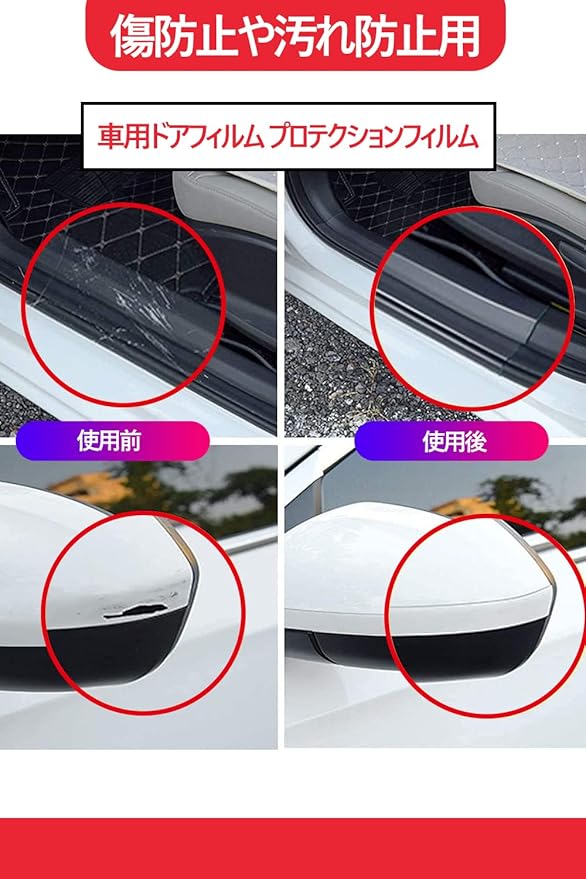 【実用性便利】 厚みのある透明フィルムで、車ドアの傷防止、汚れ防止。透明度の高いフィルムで、貼っているのが見た目には分かりにくくて、各色の車に付けても違和感がありません。