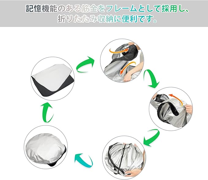 【取付簡単】サンシェードを広げて、サンシェードの靭性を利用して車のフロントガラスに取り付け、サンバイザーで挟んで固定すればいいです。あまり時間をかけなくても、初心者でも取付ができます。また、サンシェードは記憶機能のある筋金で作られていますので、収納も簡単で、車内の使用空間を占用することもなく、再使用しても変形しません。