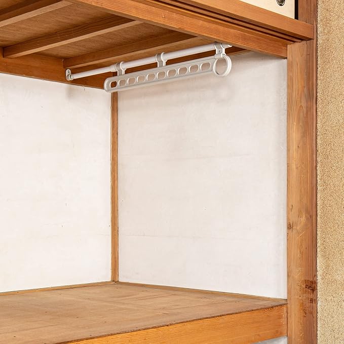 押入れをクローゼットとして活用。押入れにハンガー衣類を収納できる便利グッズ。ハンガー掛け部は手前にスライドする為、衣類が取り出しやすい。取り付け可能な幅:62~15cm押入れのかもいや桟、柱などしっかりした壁面に取り付けて使用して下さい。設置場所には付属の木ネジで穴を開ける必要があります。ハンガー掛け穴10個。耐荷重:約10㎏迄。(材質)パイプ:樹脂コーティングスチールパイプ、成型部品:ABS樹脂