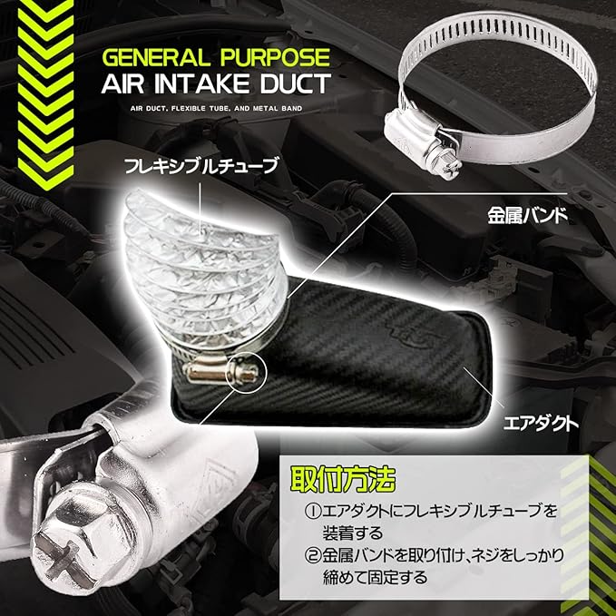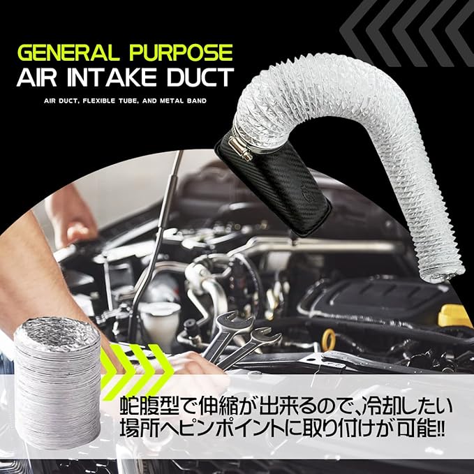 汎用エアインテークダクトエンジンなどの空気を利用する機械の吸気のほか、空気調和機、機器の冷却、室内の換気などの目的で外気を取り入れるためのエアインテークダクトです。