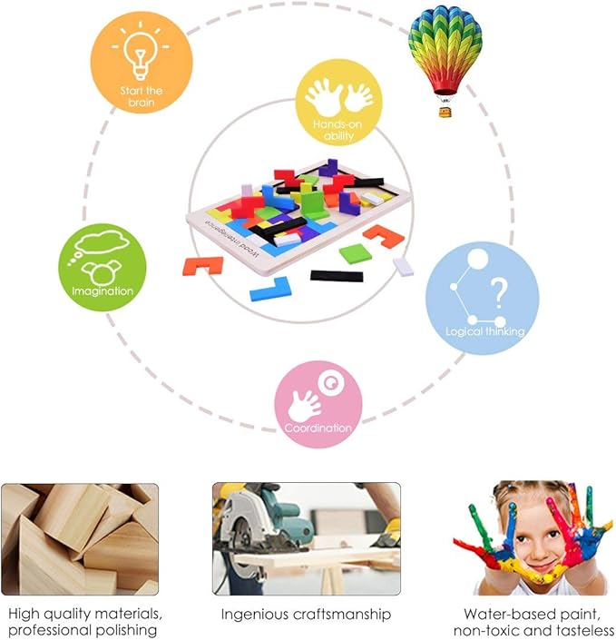楽しく遊びながら、お子様の発想力や思考判断力、図形の認識力などを養うことができます。 万が一お子様がピースを口に入れてしまっても、無害な水性塗料を使用しておりますので安心・安全です。
