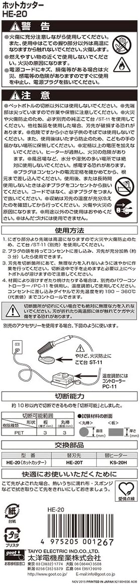 太洋電機産業(goot) ペットボトルの切断に ホットカッター HE-20 日本製