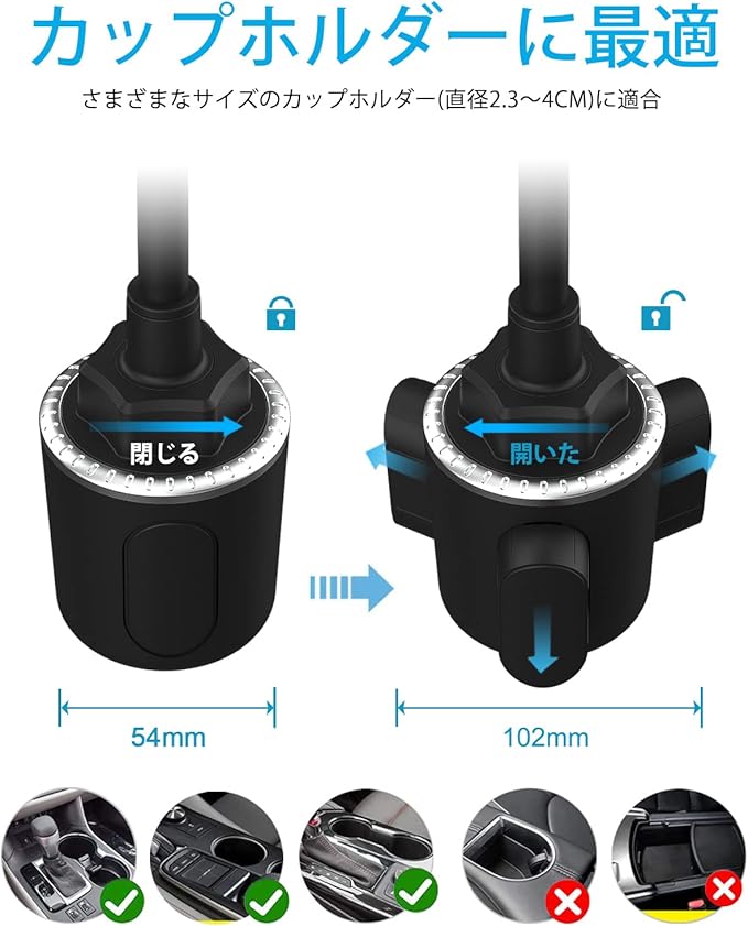 【安全で強力なベース】ベースは耐久性のあるABS素材でできており、安定した視聴体験を提供し、ほとんどの車両で54mm〜102mmのカップホルダーにしっかりと取り付けることができます。 後部座席にカップホルダーが付いている場合は、後部座席のエンターテイメントに最適です。