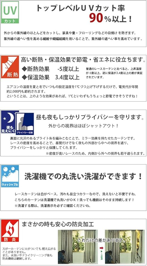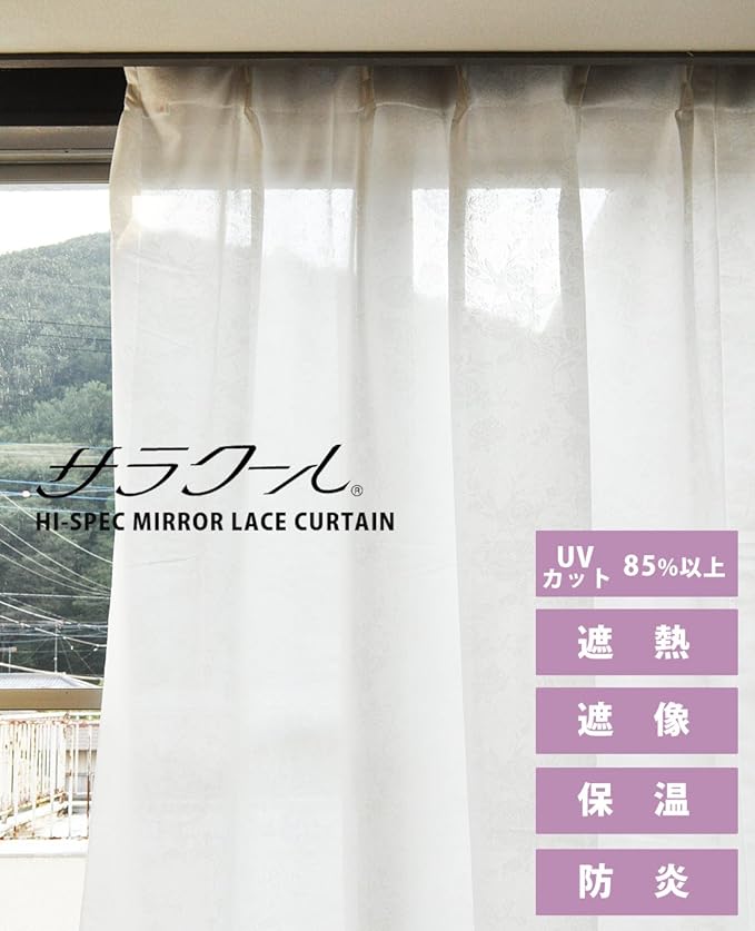 特殊機能糸「サラクール」を使用し、UVカット率90%以上と高い断熱性、保温性、遮像性を持った高機能レースカーテン。