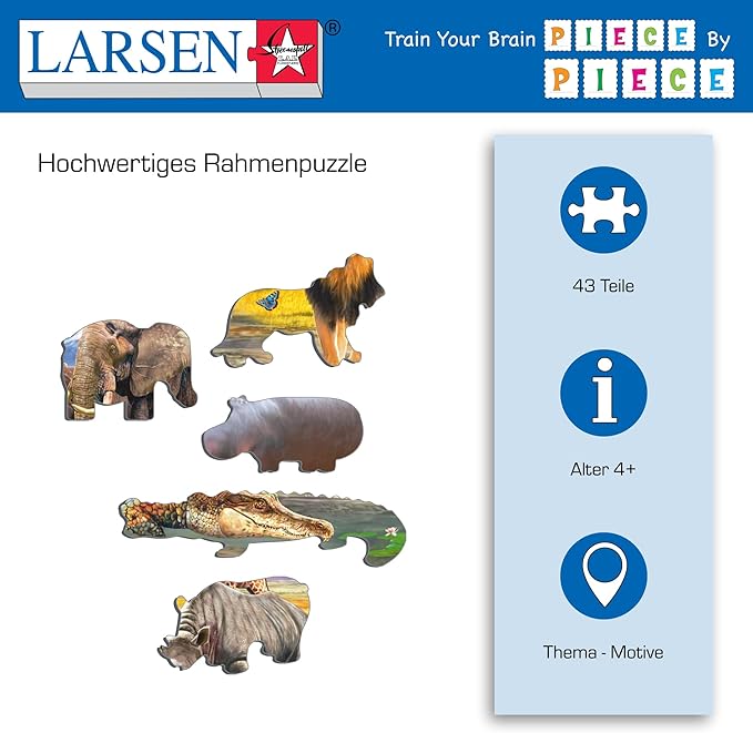 ◆【LARSENのパズル】【サバンナの動物たち】【43ピース】サバンナに生きる動物たちが描かれたジグソーパズルです。60年以上にわたり世界中で愛されているパズルメーカーLARSEN(ラーセン)の製品は、絵画のように美しい絵柄とユニークにカットされたピースが特徴です。