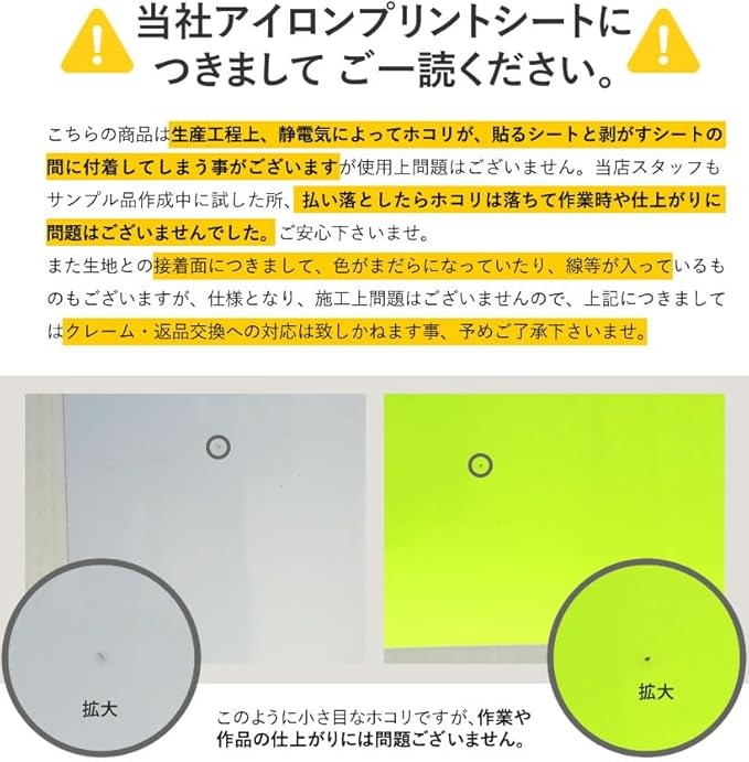 生産工程上、静電気によってホコリが貼るシートと剥がすシートの間に付着してしまう事がございますが使用上問題はございません。●取扱説明書がついています。熱いとアイロンシートも溶けやすくなるのでアイロンを中設定(約150℃)で5~15秒ほど、押さえるようにしっかり当ててください。密着が不十分な場合は、再度アイロンをかけ、プレス時間を延長したり温度を少し上げて調整してください。