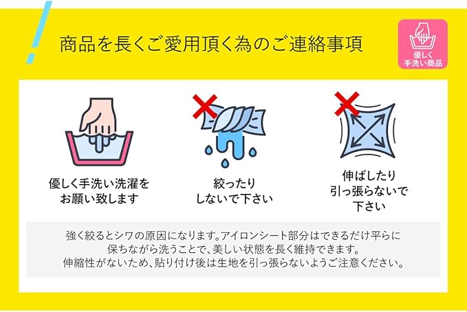 ●ニットなど凹凸や伸縮性のある生地は接着しにくく、剥がれる可能性があります。●洗濯は手洗いにて、熱湯を避け水またはぬるま湯で優しく洗うと長持ちします。●シートとフィルムの接着により色ムラや線状の跡が出る場合がありますが、仕様によるものとなります。●ご使用はお客様の判断と責任でお取り扱いをお願いします。●ご不安な方は約A4サイズの商品からお試しご確認ください。