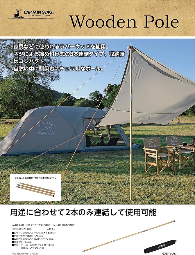 CAPTAIN STAG キャプテンスタッグ CSクラシックス 木製ポール240 3本つなぎ UP-2651 ナチュラル 組立サイズ:(約)Φ32 長さ1600mm(2連結)~2400mm(3連結)