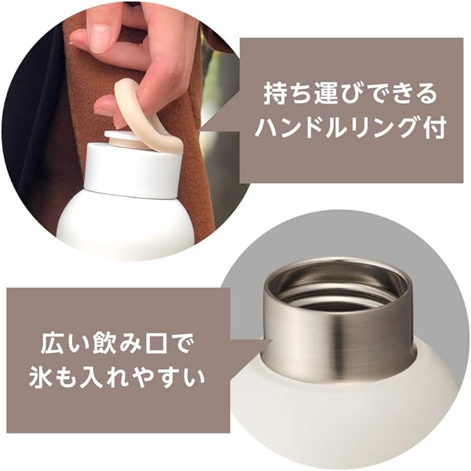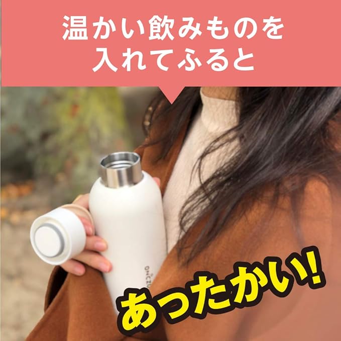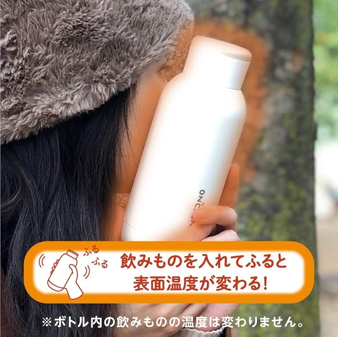 冷たい(温かい)飲みものを入れて、 ふるふるボトルを振ると、熱伝導剤がボトル表面温度を変化させます。熱湯を入れた直後に、強く振ると本体の表面が熱くなります。熱く感じた場合は、本製品を置き、少し時間をおいて使用してください。冷水(氷)を入れると、周囲の環境によって結露することがあります。
