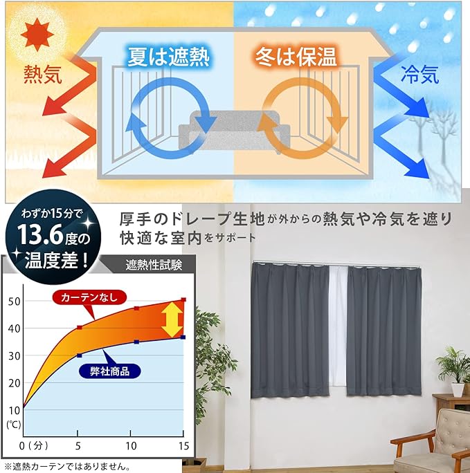 【高密度で熱移動を抑えて断熱効果も】:高密度な生地で熱や冷気を通しにくく断熱効果も。冷暖房効率UP・節電にも繋がる。