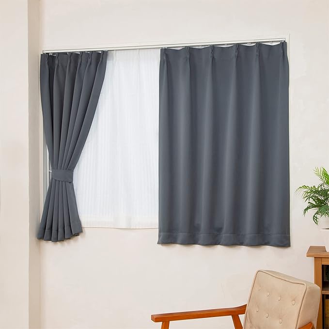 【商品仕様】:サイズ/約幅100 丈110cm、カラー/グレー、遮光率/99.99%以上(1級遮光)、内容/カーテン2枚・タッセル2本・アジャスターフック13個(予備1個含む)、材質/ポリエステル100%
