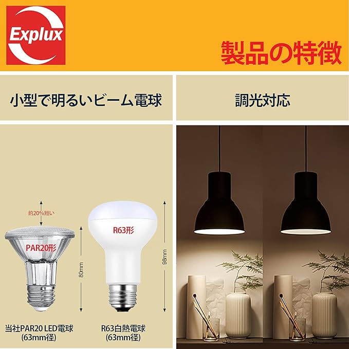 「コンパクトで明るい小型ビーム電球」従来のR60型電球より20%短いコンパクトな構造設計(外径:63mm /長さ:80mm)、90度のビーム角度で600-650㏐の高光束を実現できる。フルガラスボディは優れた屋外防水防劣化特性を持ち、幅広い用途に適しています。