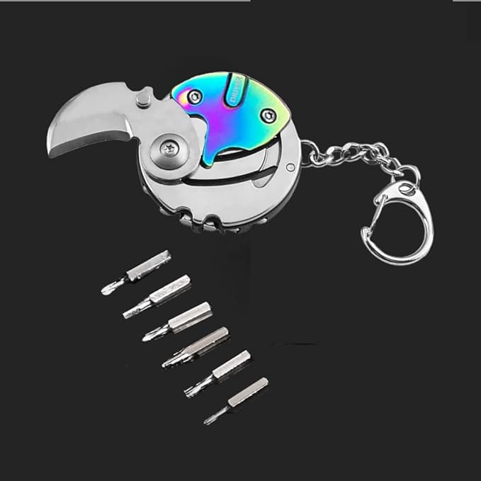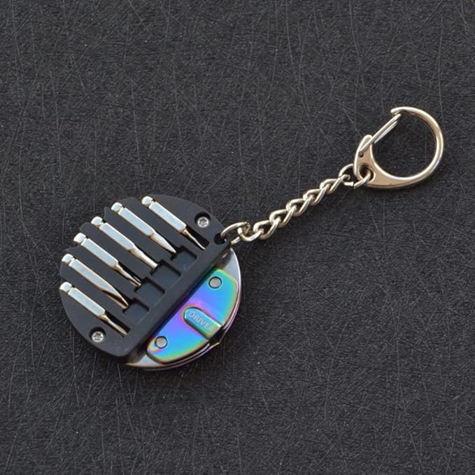 使いやすい、小さな曲がった刃に6つの機能的なドライバーと丸いキーチェーンで多機能マルチツールキーホルダーになります。 4mmプラスドライバー、1.5mmプラスドライバー、PH2プラスドライバー、PH00プラスドライバー、H3六角ドライバー、T8Tドライバーなど。 様々な工具を持ち歩くことが多い方におすすめです。