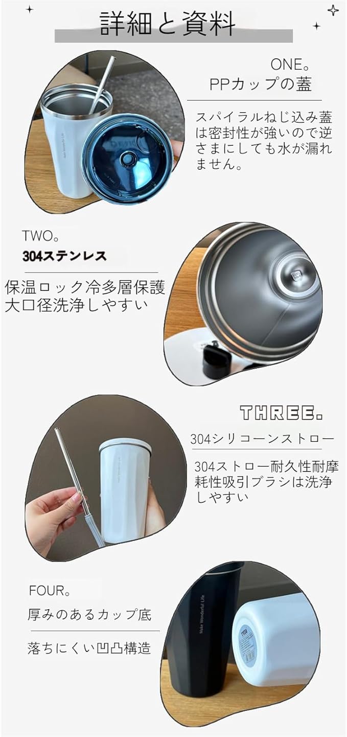 【製品仕様】素材:304ステンレス;サイズ:9.3*6.5*18.5cm、重量:372g、容量:600ml;【スタイル】: 韓国スタイル;【製造国】: 中国で製造【2023新型タンブラーグラス】ダイヤモンド型のステンレス鋼絶縁カップは、その大容量と優れた熱断熱性を備えた外出先でのコーヒー愛好家にとってスタイリッシュで実用的な選択です。カップルに最適な数時間のコーヒーを熱く保ちます。 あなたの日課【精緻な生活】ダイヤモンドシェーフステンレス鋼の絶縁カップでの飲酒体験を寛大な容量と優れた熱保持をアップグレードします。このコーヒーマグは、長い通勤や忙しい日に最適です。 あなたはコーヒー愛好家か、単に信頼できる旅行仲間が必要です、このカップはマステイブです【保温・保冷効果】この蓋付きタンブラーは保温・保冷効果が良く、約6時間保温できます、保冷効果は氷の数で決まります。また、密閉性の高い蓋なので持ち運び時にこぼれる心配もありません。(データは異なる場合があります、上記は参考値です)。 【幅広い用途】高品質なデザインと耐久性を備えたスタイリッシュなマグカップは、幅広い用途があり、オフィス、家庭、学校、バーなどのさまざまなシーンで、コーヒー、紅茶、その他のホットとアイスの飲み物を簡単に楽しむことができます、いいプレゼントとして相手を贈られます。暖かいヒント】:商品を使用していないと少し異臭がします。犬シールはランダムに組み合わせられています、表示された画像と実物には少し色差があります。手作業で測定すると誤差があるので、実際を基準にしてください
