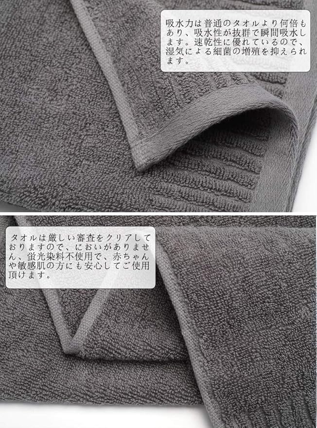 【使用上のご注意 】※綿製品だからタオルの表面に毛羽が付く場合がありまして、初回洗濯時多少毛羽落ちますので、単独でのお洗濯をおすすめします。漂白剤無し、30度以下の水温で2~3回単独洗いをオススメしております。素材の特性上、細菌やカビの繁殖を防ぐため、通気の良い乾燥した場所に置いてください。長時間直射日光に当てると、変色あるいは色褪せする場合がありますので、ご注意ください。※洗濯機の注意:パイル抜けや毛羽落ちを防ぐには、洗濯機て洗うことをおすすめしません。