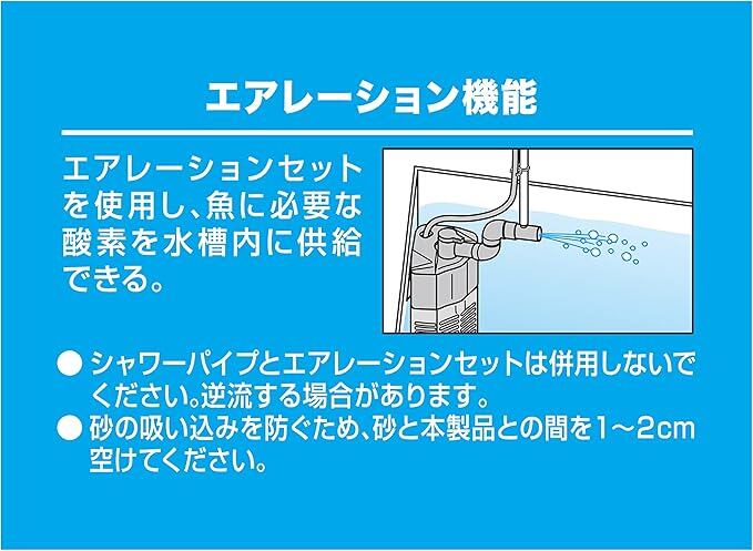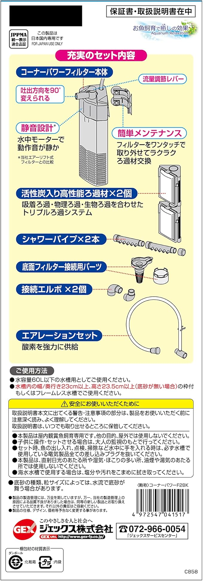 【5つの機能】1.静音設計 水中モーターで動作音が静か。※当社エアーリフト式フィルターとの比較。2.縦・横自由設置 水槽のレイアウトや魚種に合わせて設置方法が選べる。横置きにすれば水深の浅いカメ水槽にもぴったり。3.シャワーパイプで水流をつくる シャワーパイプを使用して溶存酸素量UP。ゆるやかな水流をつくる。4.コーナーだから水槽内ひろびろ コーナーにぴったりフィットするので、水槽内をひろびろ使える。魚が隙間に入らず安心。ワンタッチで取り外し簡単。5.底面フィルターと接続可能 付属のパーツを使用してGEX「マルチベースフィルター」と接続しろ過能力を更にアップ。