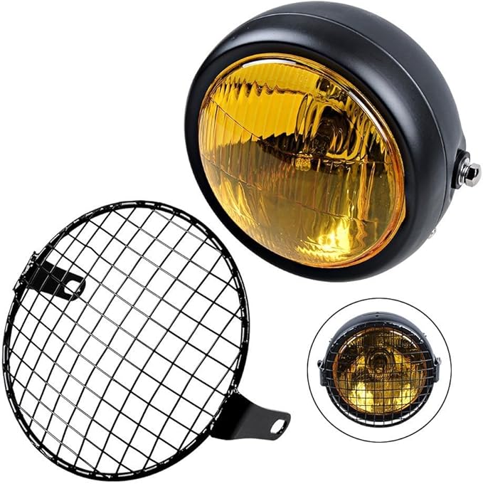 6.5インチユニバーサルオートバイアンバーヘッドライト+ヘッドランプカバーメッシュグリルカフェレーサーボブバー