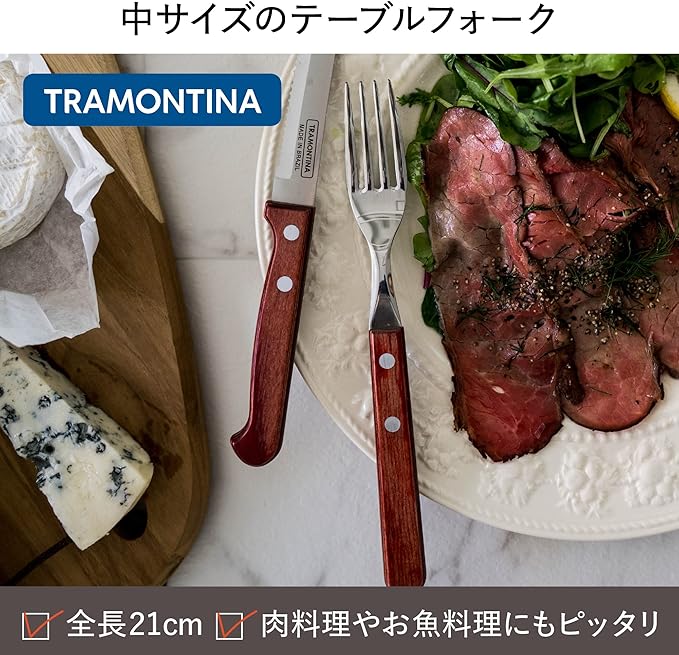 トラモンティーナ ポリウッド 高耐久天然木柄ステーキナイフ 22cm& テーブルフォーク 21cm プラス ロング 2本セット 3度の熱処理加工ナイフ レッド 食洗機対応 ブラジル製 21122/175 21110/070 TRAMONTINA