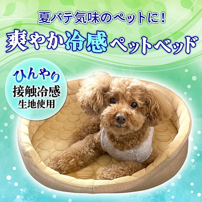 【春夏用のひんやりペットベッド】触るとひんやりする接触冷感生地を採用した夏用ペットベッドの登場です♪サイズはS/M/L/XLの4サイズ。しっかりとした作りで楕円型カドラーだから丸まって眠りやすいフォルムで快適に過ごせます。