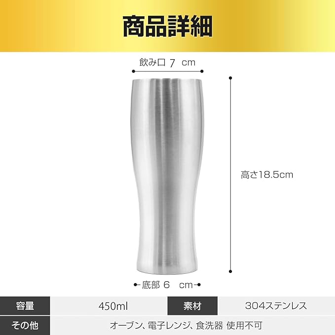 【商品詳細】 ビールグラス 1個 商品サイズ:飲み口約7㎝、底部約6㎝、高さ18.5㎝ 容量:450ml 素材:304ステンレス その他:オーブン、電子レンジ、食洗器 使用不可 〈 名入れ 不可 〉 名前入れ や 文字入れ は行っておりませんのでご了承下さい。