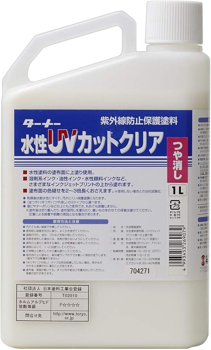さまざまなインクジェットプリントの上から塗れ、色あせをおさえる水性UVコート保護塗料。塩ビやターポリンなどにも。