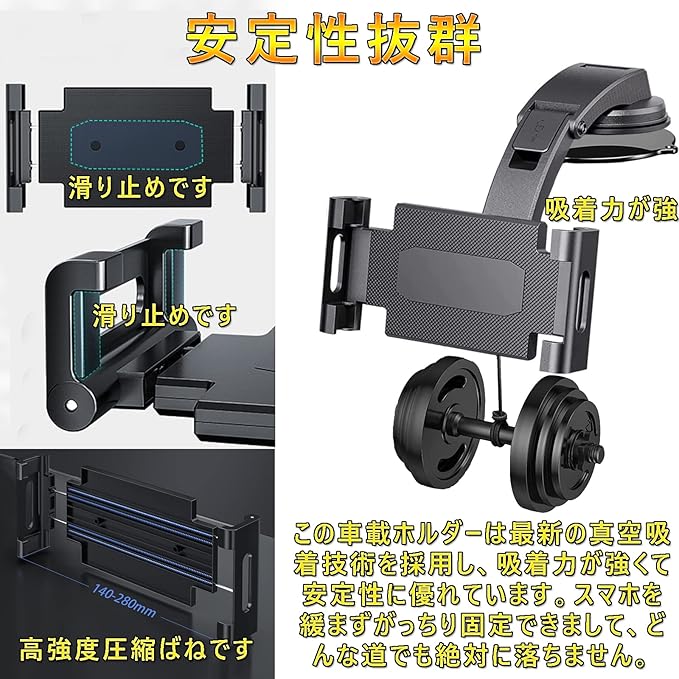 【超強力 粘着ゲル + 真空 吸盤 で&安定性抜群】この車載ホルダーは最新の真空吸着技術を採用し、吸着力が強くて安定性に優れています。高品質の素材で作られ、耐高温で耐久性が抜群です。 粘着パッドを使用すると、吸盤式車載ホルダーは吸盤パッドに取り付けて使用すると、スマホホルダーの安定性が大幅に向上し、従来型のフック式や3段クリップ式と比べて、クリップの先は平らではなく噛み込む様に改良され(ワニの歯のように)、スマホを緩まずがっちり固定できまして、どんな道でも絶対に落ちません。