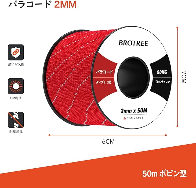 Brotree パラコード 2mm 耐荷重90kg (30m / 50m) 3芯1: 一本の耐荷重は最大90kgですが、範囲以内の重さご利用ください。安全のために、特別の場合は3本以上の数量ご利用ください。例えば:吹雪、台風期間の荷物固定、長期荷物固定など。